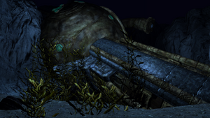 Dans les profondeurs sous-marines, deux chemins couverts par les algues s'offrent à vous : le chemin est, qui mène à un cul-de-sac, et le chemin nord, qui vous amènera au navire, à condition d'ignorer l'embranchement de l'est qui, de toute façon, vous est encore inaccessible. Le vaisseau dwemer n'a pas non plus grand-chose d'intéressant, alors poursuivez en ligne droite jusqu'aux escaliers, montez-les puis choisissez un côté – peu importe lequel, ils mènent au même endroit – avant de poursuivre jusqu'au bout du chemin. Là-bas vous attends un sphère dwemer encore en état de marche, qui a vaincu Seconde Atlantan.