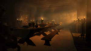 Enfin, enfin, vous parviendrez à la chambre du haut-dignitaire, qui est vide, à l'exception d'une servante endormie sur son lit et d'une lettre sur le bureau qui vous informe que vos efforts ont été encore plus fructueux que prévu. En effet, le conseil du Thalmor a décidé de démettre Elenwen de ses fonctions à compter de la réception de la missive, preuve que vos efforts précédents ont portés leurs fruits. Le seul point noir, c'est qu'Hérécinde est censé la remplacer, et, vu ce qu'il permet dans sa prison, ce n'est pas une amélioration pour la province.