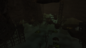 Vous arriverez alors dans une gigantesque caverne dont il est impossible de voir le fond. Pour progresser, vous devez continuer tout droit jusqu'au niveau de la roue à aube, et regarder sur votre gauche. Une passerelle de bois branlante vous permettra de passer au-dessus du vide, et atteindre la voie suivante. Vous aurez peut-être besoin d'Illumination ou d'une torche pour la voir.